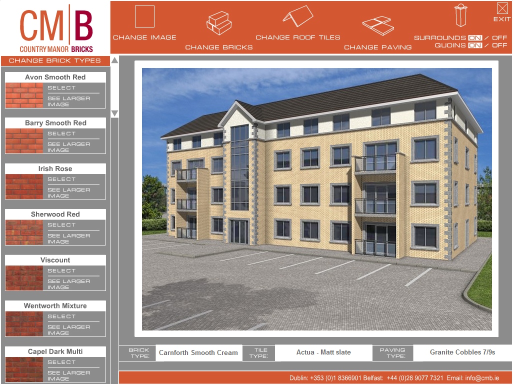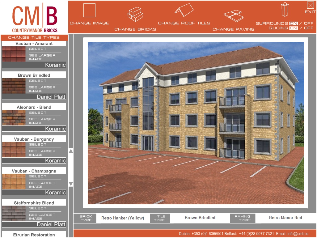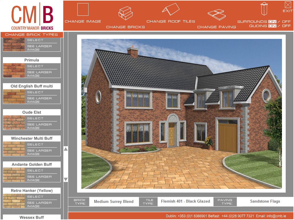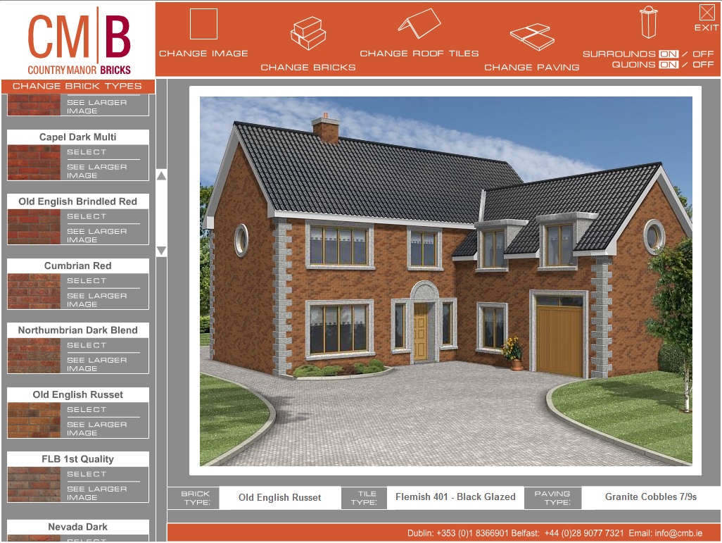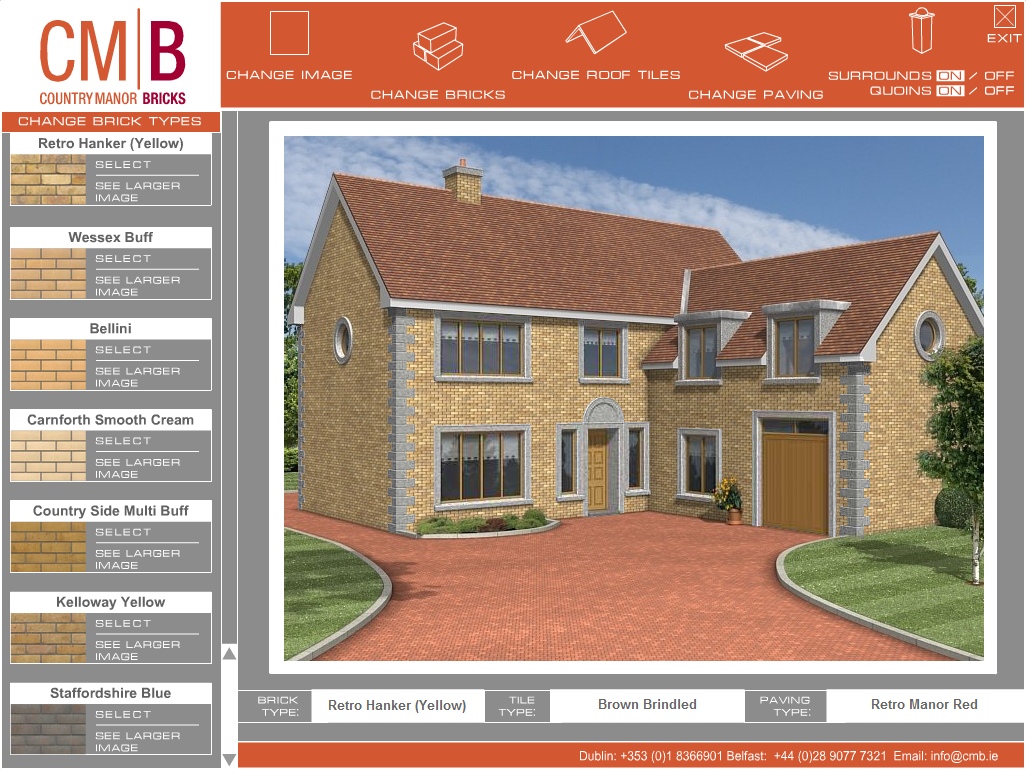 Where products are available in different designs, colours, finishes, styles etc. interactive brochures can help customers choose which configuration suits best. Screen dumps from two applications are illustrated below. The first, for a brick manufacturing company, allows customers to select an office or residential building and then change the bricks, roof tiles or paving. This application runs on a kiosk PC in their showrooms. The second example is for a fireplace manufacturer. The customer can vary wall colour and floor covering to match their living room at home and then choose different fireplaces colours/materials.