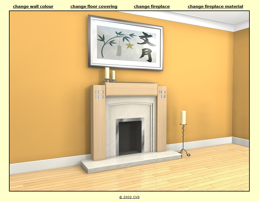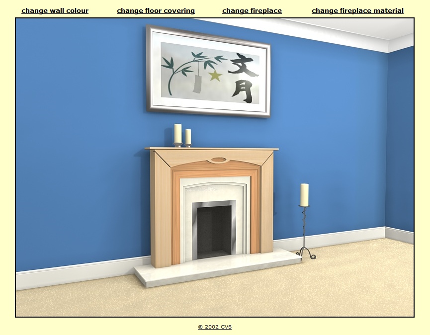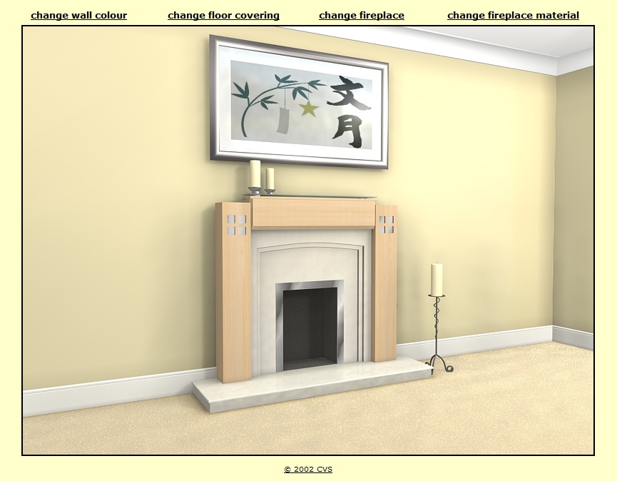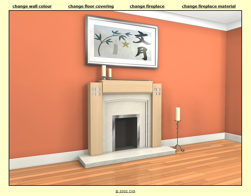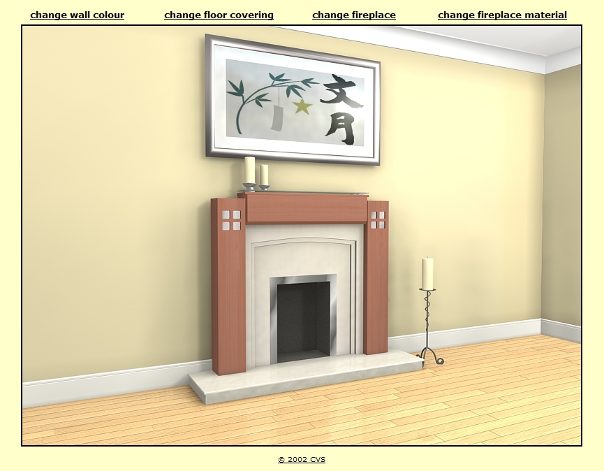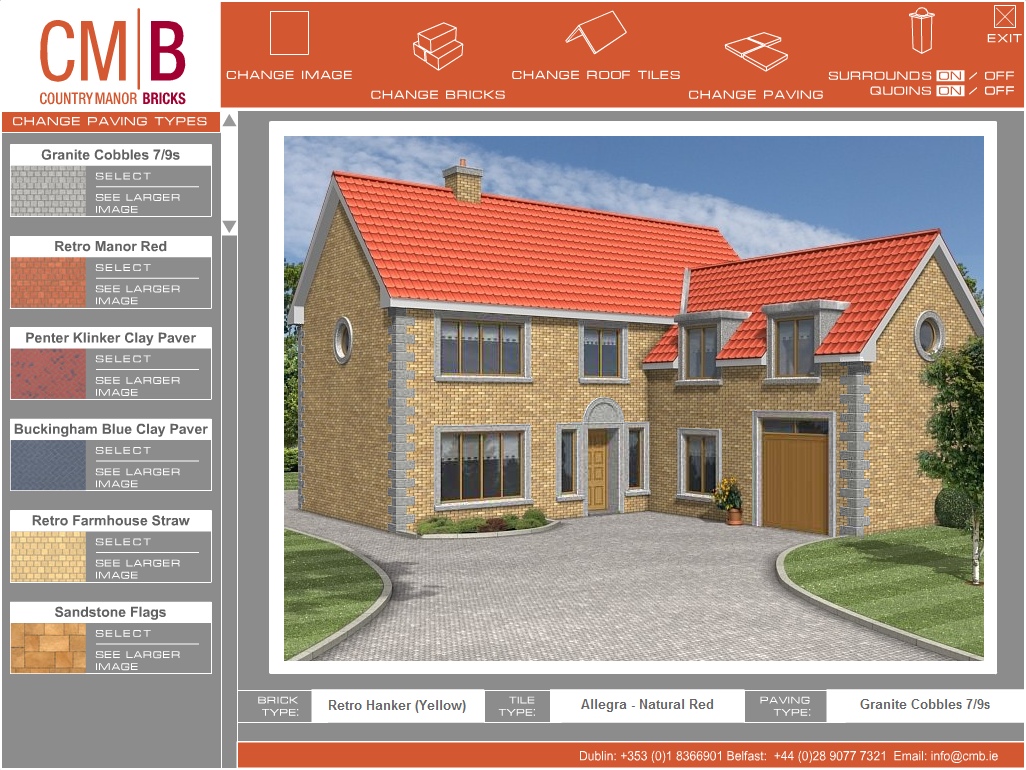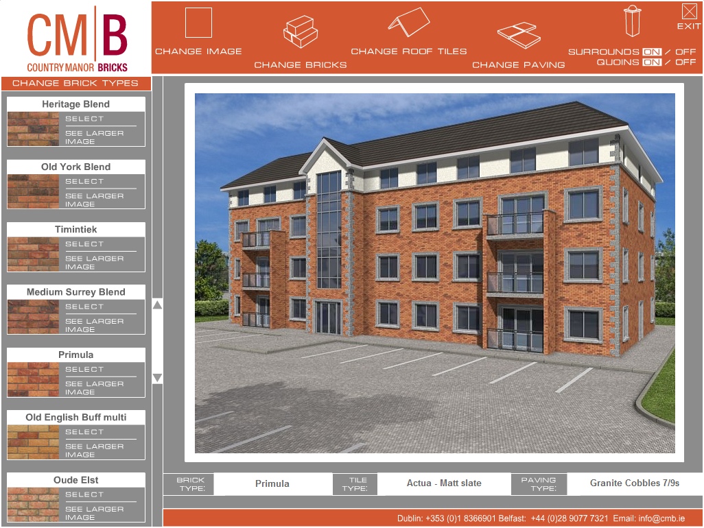 Where products are available in different designs, colours, finishes, styles etc. interactive brochures can help customers choose which configuration suits best. Screen dumps from two applications are illustrated below. The first, for a brick manufacturing company, allows customers to select an office or residential building and then change the bricks, roof tiles or paving. This application runs on a kiosk PC in their showrooms. The second example is for a fireplace manufacturer. The customer can vary wall colour and floor covering to match their living room at home and then choose different fireplaces colours/materials.